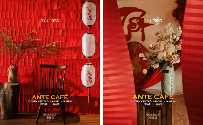 Tết ấm êm cùng ANTÉ CAFE – tọa độ cafe mở xuyên Tết, không phụ thu. Hương vị mùa Xuân đã phủ đầy trong không gian ấm áp của ANTÉ CAFE. Những góc Tết nhẹ nhàng mang sắc đỏ tươi mới, rộn ràng. Tiệm có ba tầng rộng rãi, thiết kế theo hơi hướng cổ điển, đem lại cảm giác thư giãn bình yên. Nằm ngay TTTP và có cả view sông Hàn, cầu Rồng – đây là toạ độ lý tưởng để gặp gỡ. Bên cạnh đó không gian còn phù hợp với đa dạng nhu cầuđi cà phê. ANTÉ CAFE phục vụ nhiều dòng thức uống, có bánh ngọt thơm ngon. Đồ uống được tập trung chất lượng, đặc biệt sử dụng dòng matcha Nhật cao cấp,…
