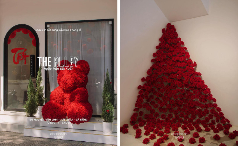 Tọa độ ngập tràn hương sắc Xuân cùng em Gấu Hoa khổng lồ. Nằm trên con đường nhộn nhịp giữa TTTP, THE ALLEY mang dáng vẻ khiêm tốn nhưng ẩn bên trong là vô vàn góc check-in Tết thú vị. Nổi bật ngay lối vào là em Gấu to lớn được đính bằng hằng trăm đóa hồng đỏ rực rỡ, không gian hai tầng phủ kín các trang trí tươi mới, đậm sắc Tết. Các concept đa dạng được thực hiện tỉ mỉ, phù hợp cho nhiều phong cách khác nhau. Ánh sáng đủ, thích hợp cho cả ban ngày lẫn đêm. Quán còn chuẩn bị sẵn phụ kiện như dù, quạt để bạn có thể sử dụng. Đặc biệt THE ALLEY sẽ mở cửa xuyên Tết, không phụ th.u. Ghé quán đón không khí xuân về nha.