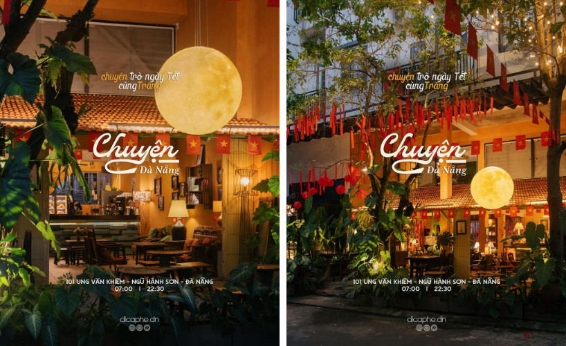 CHUYỆN – ĐÀ NẴNG trò ngày Tết cùng Trăng. CHUYỆN – ĐÀ NẴNG nép mình ở một góc phố bình lặng, dưới hàng cây cao lớn, mang nét Việt giản đơn và ấm áp. Gian nhà mái ngói của quán đã ngập tràn không khí Xuân, trang trí đơn giản mà hợp vibes, với đầy sắc đỏ may mắn. Quán phục vụ khá đa dạng từ nước đến bánh, các sản phẩm chú trọng vào chất lượng. Tiệm còn thường xuyên cho ra mắt các món mới theo mùa. Ấn tượng nhất có lẽ là Cà Phê Sữa Mè Đen – thơm béo đậm đà. Quán sẽ hoạt động xuyên Tết, cùng ghé gian nhà nhỏ trò chuyện đón Xuân về nha.
