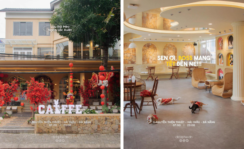 Không khí Tết đã về với CATFFE – nơi trú ẩn yên bình cho các “Boss” nằm ngay giữa TTTP. Khoảng sân rộng rãi được phủ kín bởi sắc đỏ may mắn, các góc check-in Tết được đầu tư chỉn chu, không gian lung linh nổi bật cả một con phố. Các bé mèo được lên đồ siêu xinh, đầy màu sắc tươi mới.CATFFE sẽ mở cửa phục vụ xuyên Tết, du Xuân đi cà phê mèo – ngắm mèo nhé.