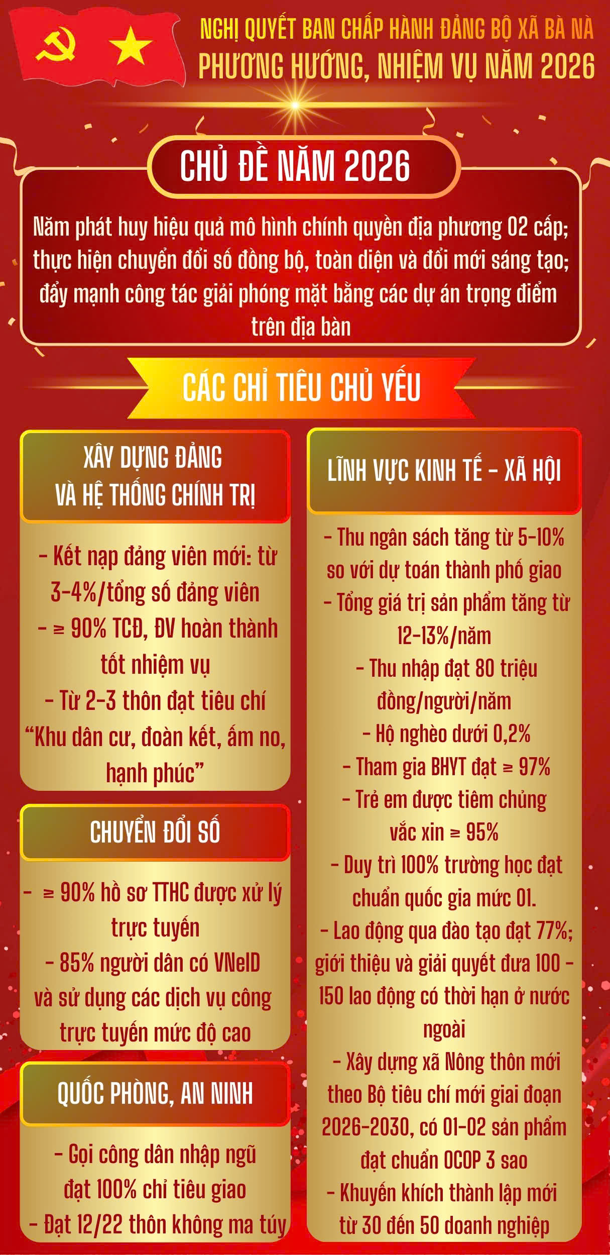 (Infographics) Các chỉ tiêu chủ yếu được xác định trong Nghị quyết số 12-NQ/ĐU ngày 18/12/2025 của Ban Chấp hành Đảng bộ xã Bà Nà về phương hướng, nhiệm vụ năm 2026
