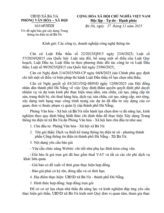 Phòng Văn hóa - Xã hội xã Bà Nà tiến hành lựa chọn đơn vị đủ năng lực, kinh nghiệm theo quy định bằng hình thức chỉ định thầu để thực hiện Xây dựng Trang thông tin điện tử xã Bà Nà do Phòng Văn hóa - Xã hội làm chủ đầu tư