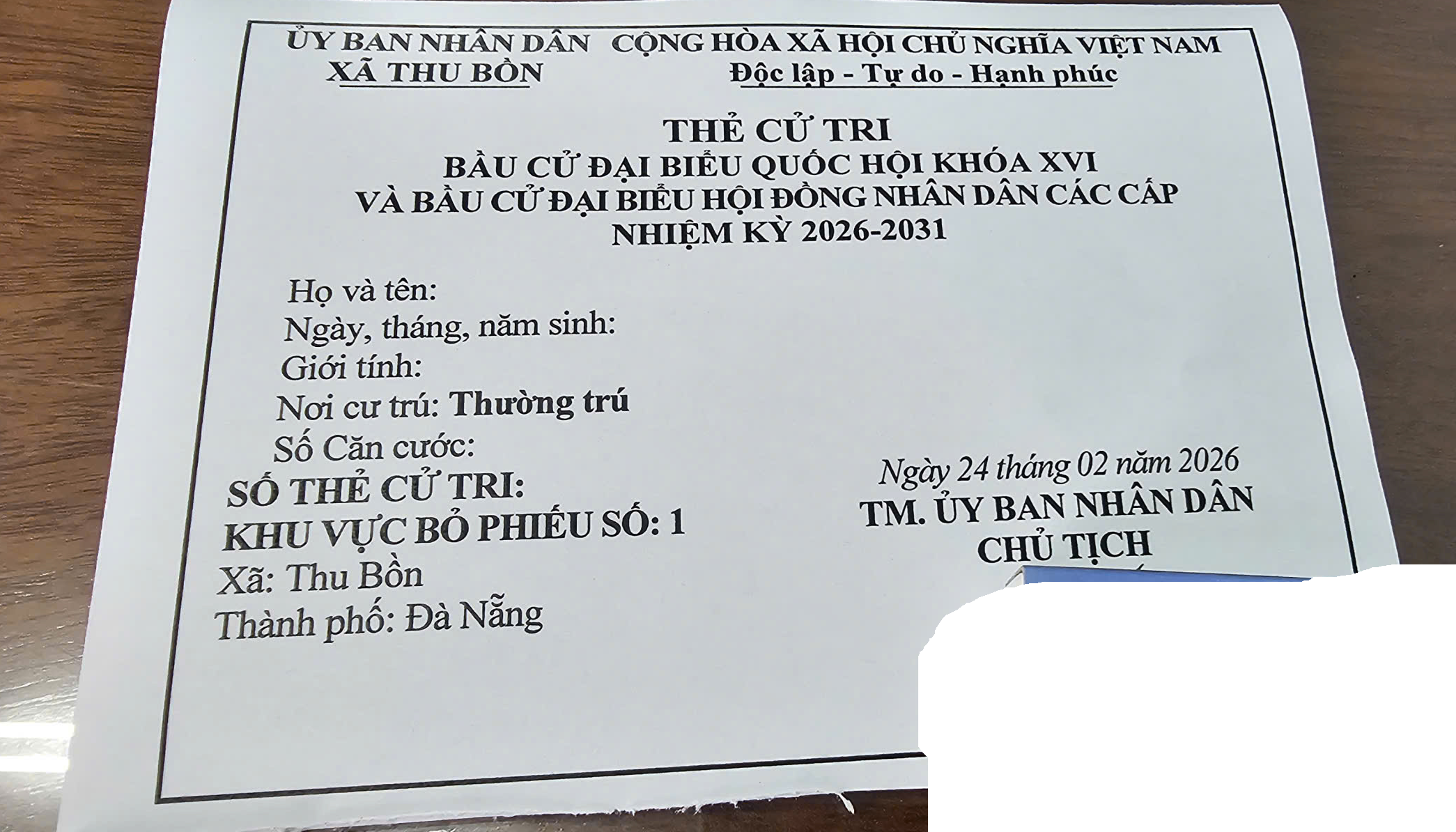 Cử tri xuất trình thẻ cử tri/CCCD tại bàn hướng dẫn, nhận phiếu bầu từ Tổ bầu cử gồm:
