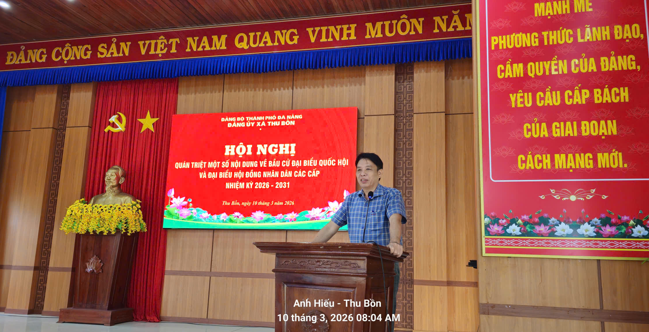 Sáng ngày 10/3/2026, tại Hội trường Đảng ủy xã, Ban Thường vụ Đảng ủy xã Thu Bồn đã tổ chức Hội nghị quán triệt, định hướng một số nội dung quan trọng về công tác bầu cử đại biểu Quốc hội khóa XVI và đại biểu Hội đồng nhân dân (HĐND) các cấp nhiệm kỳ 2026 - 2031 trên địa bàn xã.