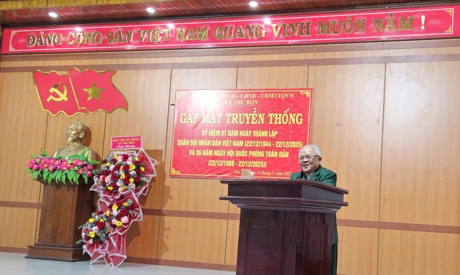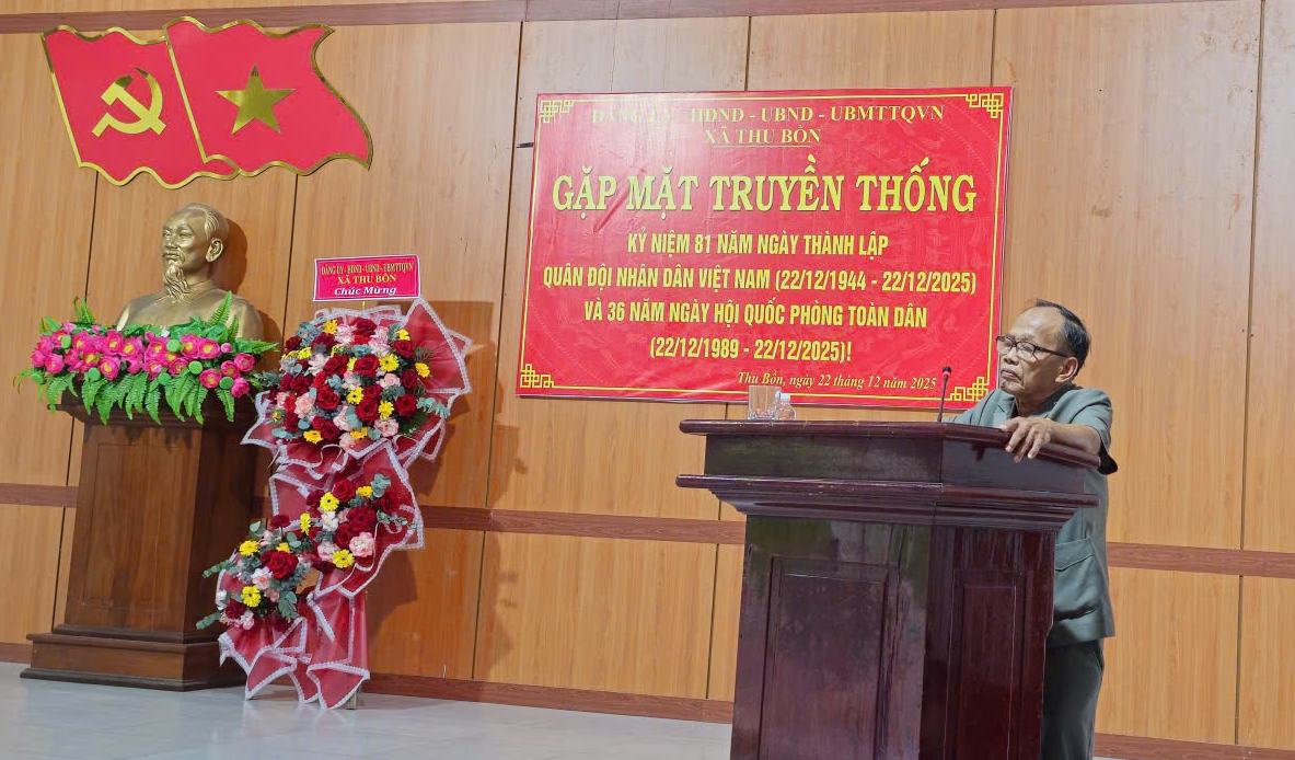 Trong không khí đầy tự hào của những ngày tháng 12 lịch sử, chiều ngày 22/12, Đảng ủy - HĐND - UBND - UBMTTQVN xã Thu Bồn đã long trọng tổ chức buổi gặp mặt truyền thống kỷ niệm 81 năm Ngày thành lập Quân đội nhân dân (QĐND) Việt Nam (22/12/1944 - 22/12/2025) và 36 năm Ngày hội Quốc phòng toàn dân (22/12/1989 - 22/12/2025).