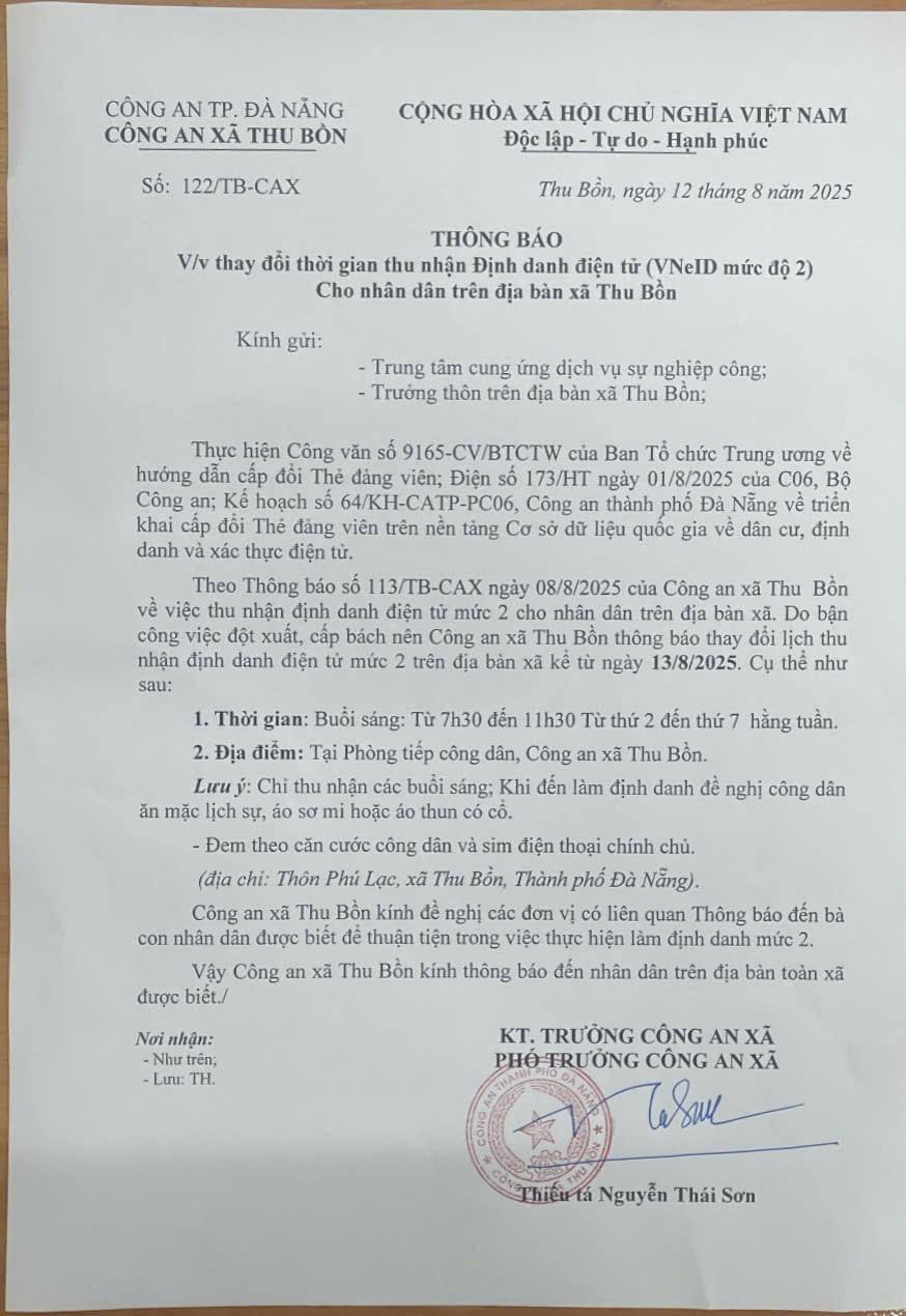 Do bận thực hiện nhiệm vụ cấp bách, nên Công an xã Thu Bồn thông báo thay đổi thời gian thu nhận định danh điện tử mức 2 kể từ ngày 13/8/2025 như sau: