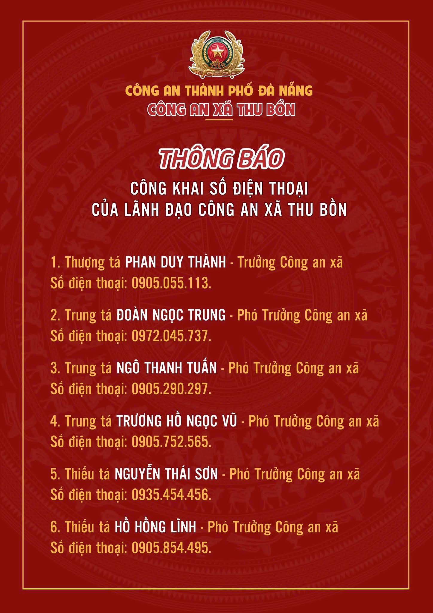 CÔNG KHAI SỐ ĐIỆN THOẠI CỦA LÃNH ĐẠO CÔNG AN XÃ THU BỒN