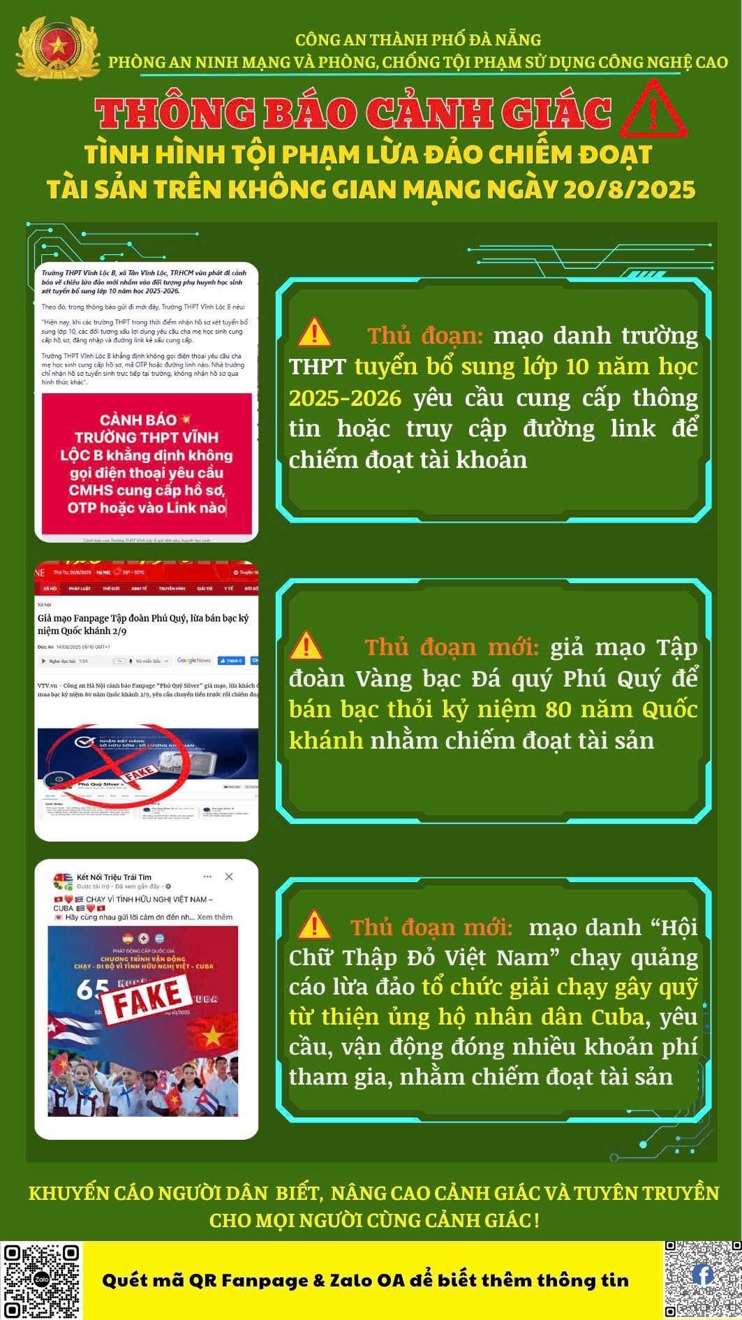 Thông báo cảnh giác tình hình tội phạm lừa đảo chiếm đoạt tài sản trên không gian mạng ngày 20/08/2025