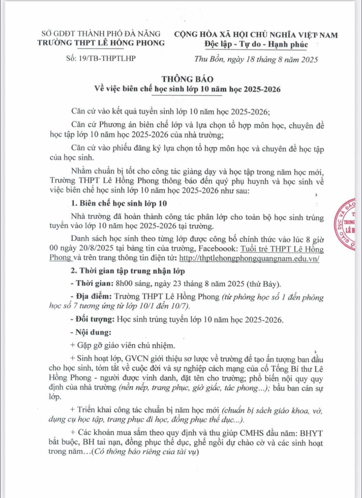 Thông báo của Trường THPT Lê Hồng Phong về việc biên chế học sinh lớp 10 năm học 2025-2026